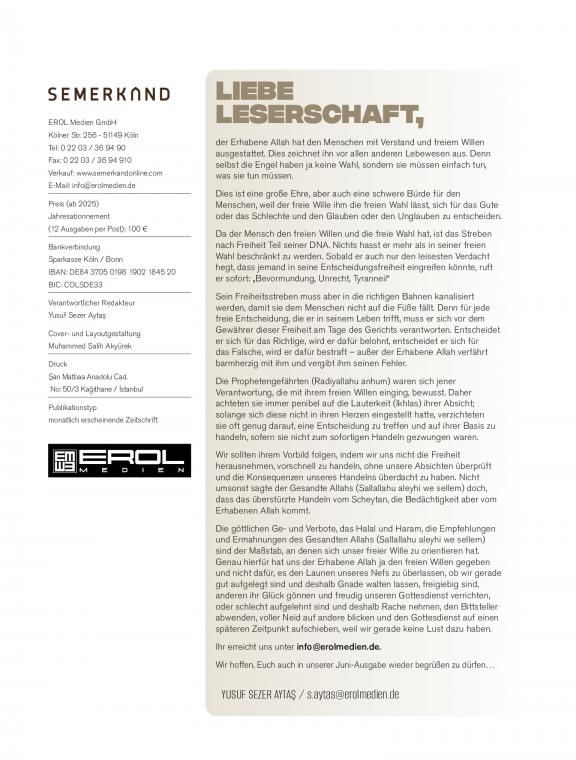 Semerkand – Die islamische Zeitschrift auf Deutsch Die Semerkand Zeitschrift ist eine monatlich erscheinende Publikation, die seit vielen Jahren eine Brücke zwischen klassischer islamischer Gelehrsamkeit und den Lebensrealitäten der heutigen Muslime in Europa schlägt. Sie behandelt Themen wie Glaubenslehre (Aqide), Gottesdienst (Ibade), Biografie (Sira) und Benehmen (Edeb) in einer klaren, tiefgründigen und zugleich verständlichen Sprache. Dabei stützt sie sich auf die Qur’an-Verse, die Sunna des Propheten (Sallallahu aleyhi we sellem) sowie auf die Weisheit der großen Gelehrten und Sufis vergangener Jahrhunderte. Die Zeitschrift legt besonderen Wert auf die Vermittlung von spiritueller Tiefe und praktischer Lebensführung: Sie erinnert an die Grundlagen des Glaubens und der Reinheit des Herzens. Sie stärkt das Bewusstsein für die Bedeutung von Moral, Familie und Gemeinschaft. Sie bietet Antworten auf die Fragen des modernen Alltags aus islamischer Sicht. Die deutsche Ausgabe eröffnet auch deutschsprachigen Muslimen – und jenen, die sich für den Islam interessieren – einen Zugang zu der reichen Tradition islamischer Weisheit. Mit ihrem literarisch-geistigen Stil ist die Semerkand Zeitschrift nicht nur eine Informationsquelle, sondern auch ein Wegweiser zur inneren Erneuerung und spirituellen Vertiefung.