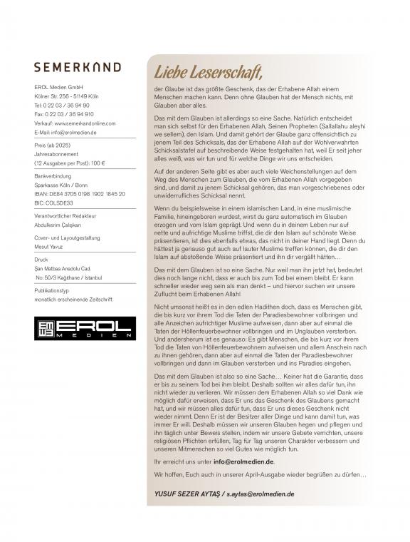 Semerkand – Die islamische Zeitschrift auf Deutsch Die Semerkand Zeitschrift ist eine monatlich erscheinende Publikation, die seit vielen Jahren eine Brücke zwischen klassischer islamischer Gelehrsamkeit und den Lebensrealitäten der heutigen Muslime in Europa schlägt. Sie behandelt Themen wie Glaubenslehre (Aqide), Gottesdienst (Ibade), Biografie (Sira) und Benehmen (Edeb) in einer klaren, tiefgründigen und zugleich verständlichen Sprache. Dabei stützt sie sich auf die Qur’an-Verse, die Sunna des Propheten (Sallallahu aleyhi we sellem) sowie auf die Weisheit der großen Gelehrten und Sufis vergangener Jahrhunderte. Die Zeitschrift legt besonderen Wert auf die Vermittlung von spiritueller Tiefe und praktischer Lebensführung: Sie erinnert an die Grundlagen des Glaubens und der Reinheit des Herzens. Sie stärkt das Bewusstsein für die Bedeutung von Moral, Familie und Gemeinschaft. Sie bietet Antworten auf die Fragen des modernen Alltags aus islamischer Sicht. Die deutsche Ausgabe eröffnet auch deutschsprachigen Muslimen – und jenen, die sich für den Islam interessieren – einen Zugang zu der reichen Tradition islamischer Weisheit. Mit ihrem literarisch-geistigen Stil ist die Semerkand Zeitschrift nicht nur eine Informationsquelle, sondern auch ein Wegweiser zur inneren Erneuerung und spirituellen Vertiefung.