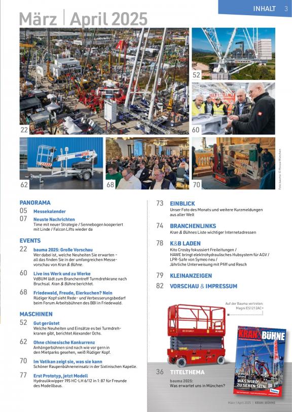 Alle Magazine des Vertikal Verlags bieten fachliche und unabhängige Berichterstattung über die Hebeindustrie mit dem Fokus auf Krane, Arbeitsbühnen, Teleskoplader und Ladekrane.