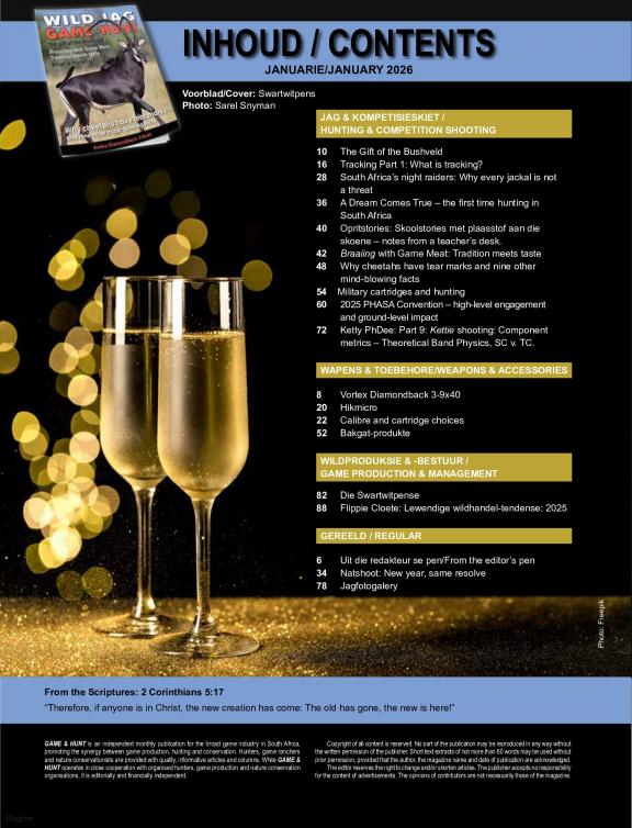 WILD & JAG/ GAME & HUNT is an independent monthly publication for the broad game industry in South Africa, promoting the synergy between game production, hunting and conservation. Hunters, game ranchers and nature conservationists are served with quality informative articles and columns. GAME & HUNT is a magazine that promotes a lifestyle to the kind of reader who does not remain just a reader but becomes a follower of the GAME & HUNT brand. While WILD & JAG/ GAME & HUNT operates in close cooperation with organised hunters, game production and nature-conservation organisations, it is editorially and financially independent. In every edition is to be found a lead article on an important aspect of the wildlife industry as well as an article on a specific animal - including small game, big game and carnivores. Also a nature article (scientific cum popular) on South Africa's plant life and/or geographical features.