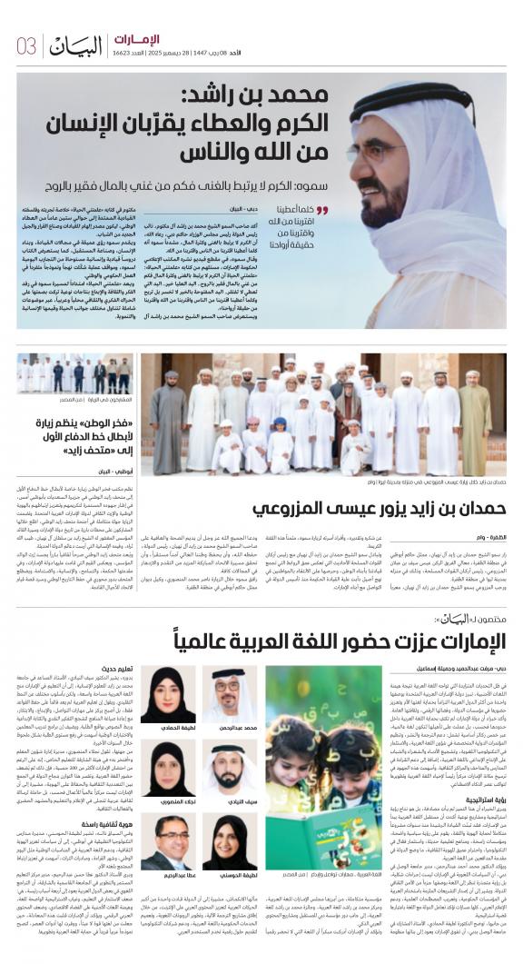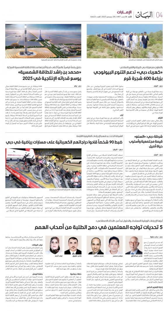 يمكنك الآن الاستمتاع بتصفح النسخة الرقمية، والتي هي طبق الأصل عن النسخة الورقية لصحيفة البيان على هاتفكم الذكي أو الجهاز اللوحي أو على شاشة الحاسوب. النسخة الرقمية تتيح لكم تجربة متميزة للعدد اليومي بكل المقالات والأخبار والميزات وبطريقة سلسة حيث يمكنكم التمتع بقراءة صفحاتكم المفضلة مع إمكانية البحث ومشاركة الأخبار في أي وقت وأي مكان كمرادف عن النسخة الورقية. بالإضافة لميزة القراءة بدون إنترنت عند تحميل النسخة المطلوبة وميزات أخرى ستتعرفون عليها عند تحميل التطبيق. في العاشر من مايو سنة 1980 صدر العدد الأول من صحيفة "البيان" لكي تشكل خلال رحلة مستمرة خلال العقود الأربعة مدرسة صحافية خرجت أجيالا من الصحافيين على مستوى دولة الإمارات والعالم العربي. وتصدر الصحيفة، التي تتبع مؤسسة دبي للإعلام، يومياً في نسخ ورقية ورقمية، تصل الى جمهور عريض من المتابعين في دولة الإمارات وعلى امتداد العالم العربي والعالم.