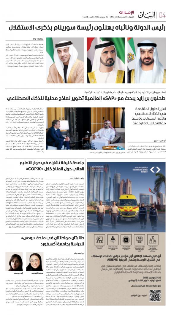 يمكنك الآن الاستمتاع بتصفح النسخة الرقمية، والتي هي طبق الأصل عن النسخة الورقية لصحيفة البيان على هاتفكم الذكي أو الجهاز اللوحي أو على شاشة الحاسوب. النسخة الرقمية تتيح لكم تجربة متميزة للعدد اليومي بكل المقالات والأخبار والميزات وبطريقة سلسة حيث يمكنكم التمتع بقراءة صفحاتكم المفضلة مع إمكانية البحث ومشاركة الأخبار في أي وقت وأي مكان كمرادف عن النسخة الورقية. بالإضافة لميزة القراءة بدون إنترنت عند تحميل النسخة المطلوبة وميزات أخرى ستتعرفون عليها عند تحميل التطبيق. في العاشر من مايو سنة 1980 صدر العدد الأول من صحيفة "البيان" لكي تشكل خلال رحلة مستمرة خلال العقود الأربعة مدرسة صحافية خرجت أجيالا من الصحافيين على مستوى دولة الإمارات والعالم العربي. وتصدر الصحيفة، التي تتبع مؤسسة دبي للإعلام، يومياً في نسخ ورقية ورقمية، تصل الى جمهور عريض من المتابعين في دولة الإمارات وعلى امتداد العالم العربي والعالم.