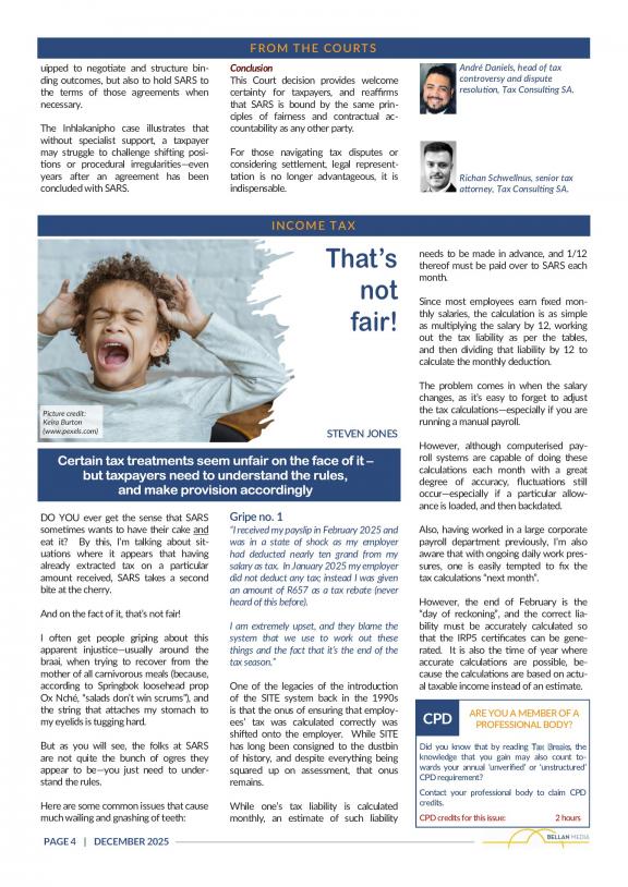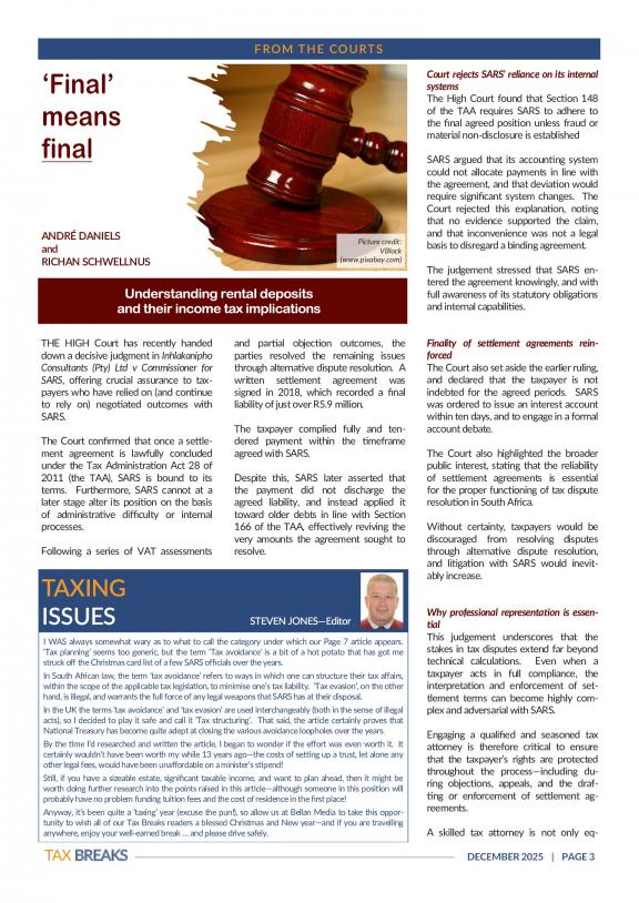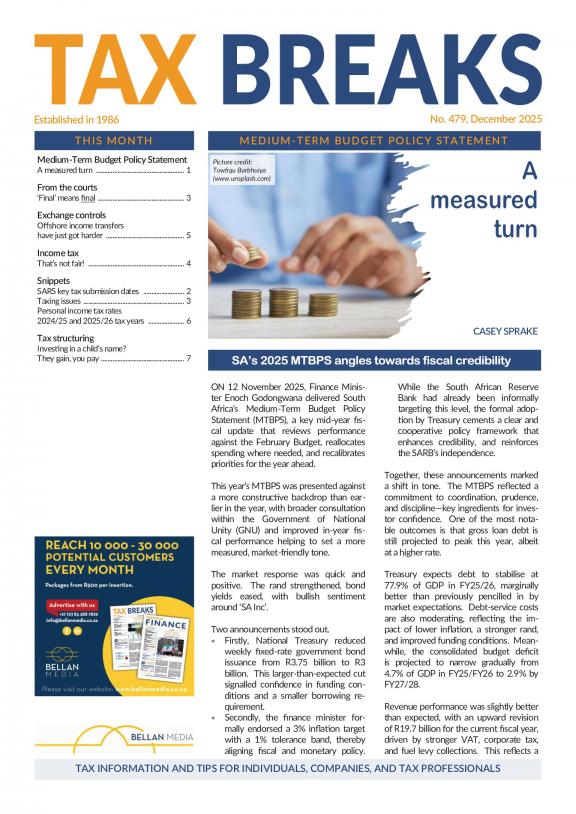 Tax Breaks draws from the collective wisdom of the country's leading tax experts, helping subscribers minimise their tax bills, understand their compliance obligations, structure their affairs in a tax-efficient manner, interact with SARS, and be kept up to date on all the latest tax issues.