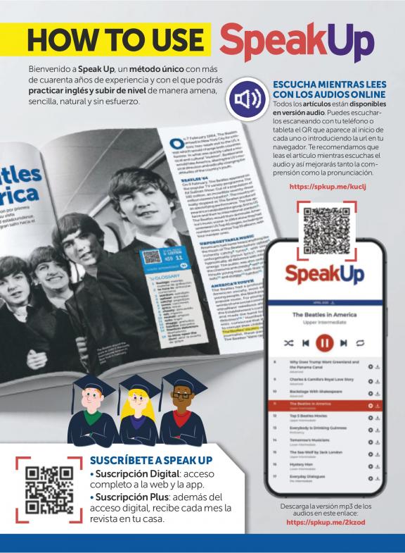 Cada mes con la revista Speak up podrás mejorar tu inglés con artículos y entrevistas con expertos y personajes de interés. Accederás a la actualidad y te mantendrás al día con el vocabulario de uso actual, como neologismos, conceptos de moda y expresiones coloquiales. Practicarás el inglés de forma amena y sencilla, a través de la lectura y la escucha de los textos de inglés. Además, con la revista tendrás acceso a todos los audios de los artículos online y descargables, junto con un librito de ejercicios.