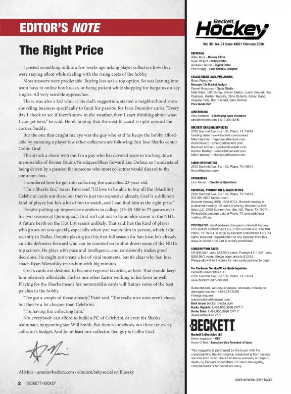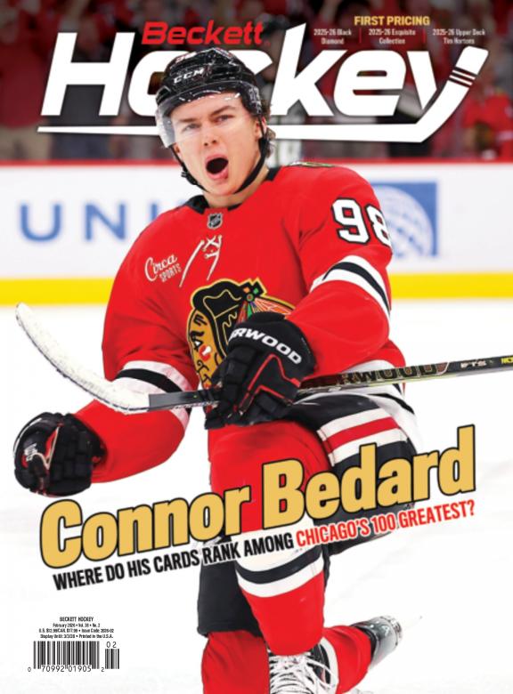 Beckett Hockey is a monthly magazine that features values on trading, including new releases. There are also articles on current trends, the latest releases and reviews of just-released products. Passionate readers use this magazine to find the worth of their cards, hot player and Rookie Cards to watch. Beckett Hockey is deal for longtime and novice collectors. Each issue has: • The Hockey Card Price Guide with more than 100 pages filled with values for past current releases. • The Hot List, a monthly guide with pricing and images for the top 20 hockey cards on the market • Articles with information on the latest trends and news in the hobby • Reviews of the latest hockey releases • Previews of upcoming products