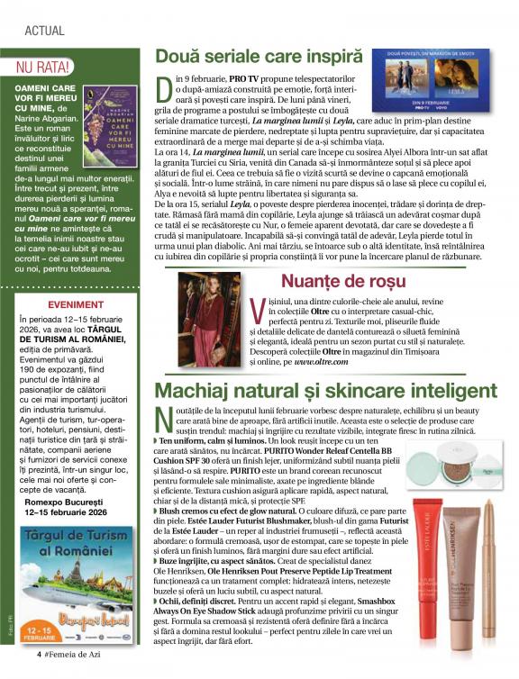 The information provided by Femeia de azi, is one of the present, a common everyday universe, close to the heart of women, debating topics of general interest, related to daily life. It addresses the woman concerned to learn more practical things, easy to reach, about health and lifestyle, eager to learn something new, to draw inspiration from fashion outfits from fashion markets.