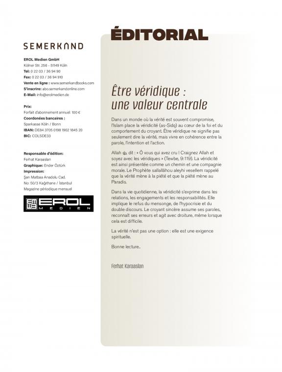 L’apparence intérieure À la lumière des versets et des hadiths, nous savons que le but principal est d’embellir nos coeurs. Nous observons que l’endroit où Allah le Très-Haut regarde est notre intérieur. Chaque action que nous accomplissons dans cette vie doit nous mener vers une belle moralité et embellir notre intérieur. À chaque instant, nous devons garder cette question à l’esprit et orienter nos efforts dans cette direction. Nous devons orienter notre boussole dans la bonne direction, et diriger notre vie au bon endroit, avec les bonnes personnes et les bonnes sources. Ce magazine que vous avez entre les mains est un remède qui nous mènera au but principal. En espérant qu’il soit bénéfique… Bonne lecture..