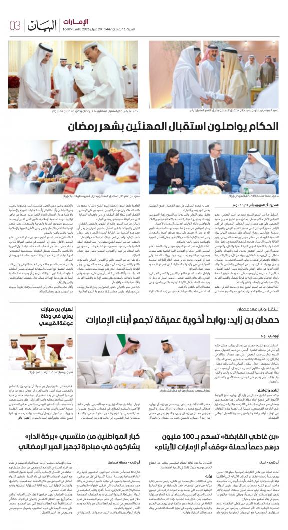 يمكنك الآن الاستمتاع بتصفح النسخة الرقمية، والتي هي طبق الأصل عن النسخة الورقية لصحيفة البيان على هاتفكم الذكي أو الجهاز اللوحي أو على شاشة الحاسوب. النسخة الرقمية تتيح لكم تجربة متميزة للعدد اليومي بكل المقالات والأخبار والميزات وبطريقة سلسة حيث يمكنكم التمتع بقراءة صفحاتكم المفضلة مع إمكانية البحث ومشاركة الأخبار في أي وقت وأي مكان كمرادف عن النسخة الورقية. بالإضافة لميزة القراءة بدون إنترنت عند تحميل النسخة المطلوبة وميزات أخرى ستتعرفون عليها عند تحميل التطبيق. في العاشر من مايو سنة 1980 صدر العدد الأول من صحيفة "البيان" لكي تشكل خلال رحلة مستمرة خلال العقود الأربعة مدرسة صحافية خرجت أجيالا من الصحافيين على مستوى دولة الإمارات والعالم العربي. وتصدر الصحيفة، التي تتبع مؤسسة دبي للإعلام، يومياً في نسخ ورقية ورقمية، تصل الى جمهور عريض من المتابعين في دولة الإمارات وعلى امتداد العالم العربي والعالم.