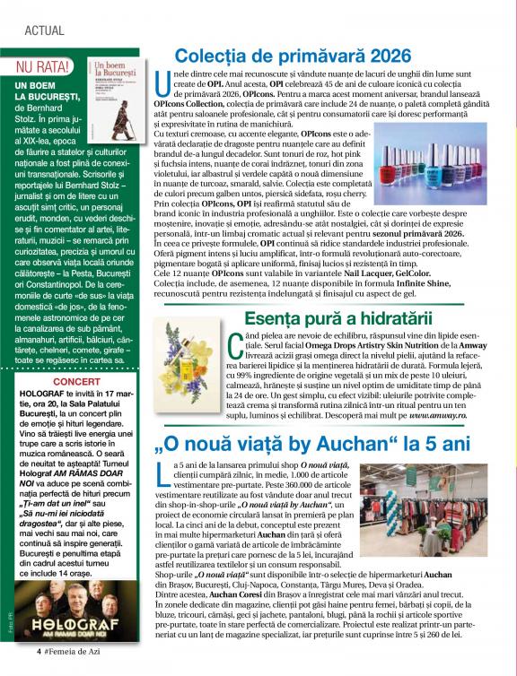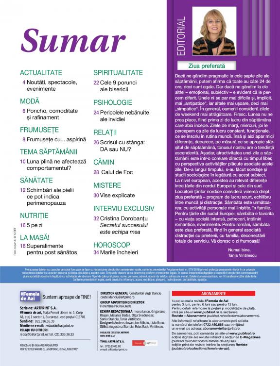 The information provided by Femeia de azi, is one of the present, a common everyday universe, close to the heart of women, debating topics of general interest, related to daily life. It addresses the woman concerned to learn more practical things, easy to reach, about health and lifestyle, eager to learn something new, to draw inspiration from fashion outfits from fashion markets.