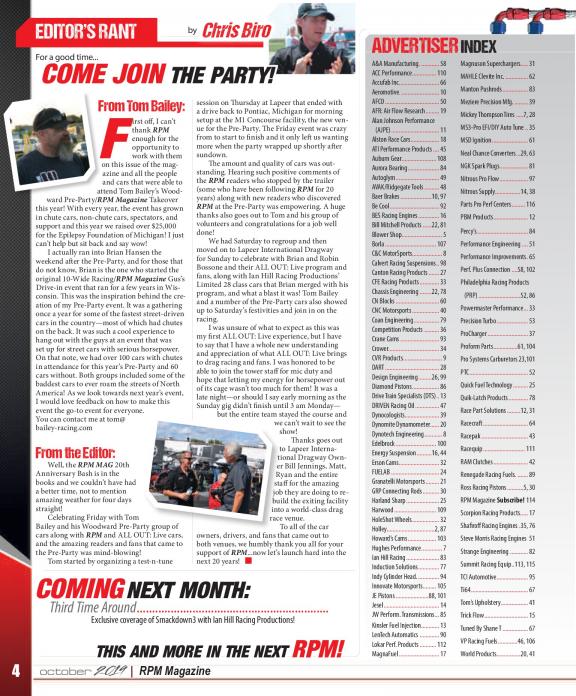The focus of RPM is to bring a diverse mix of high performance street and race automobiles to life within its pages including: Race cars, musclecars, hot rods and street legal machines with an emphasis on the "Extreme" including Fast doorslammer and outlaw forms of Drag Racing. Not familiar with these types of cars? They are considered to be the top shelf of the industry and are on the edge with regards to design and power. Grab your copy today and check it out. We are sure you will want more!