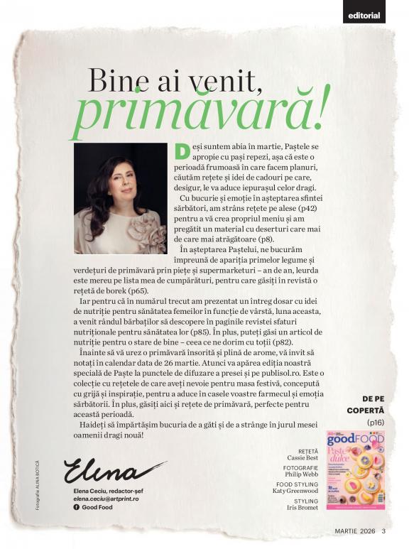 „Good Food România este pentru cei care abia așteaptă weekendul ca să pregătească reţeta de tort spectaculos la care au visat toată săptămâna. Pentru cei care își petrec sâmbătă dimineaţa ore în șir în pieţe și în băcănii, ca să descopere cele mai noi și proaspete ingrediente și care, de luni până vineri, atunci când sunt la birou, visează la pastele pe care le vor pregăti seara acasă. Pentru noi, mâncarea e una dintre cele mai mari plăceri, fie că o pregătim noi, fie că o căutăm în restaurante, fie că doar visăm la ea cu ochii deschiși în fiecare zi.” Oana Titică, Redactor Șef