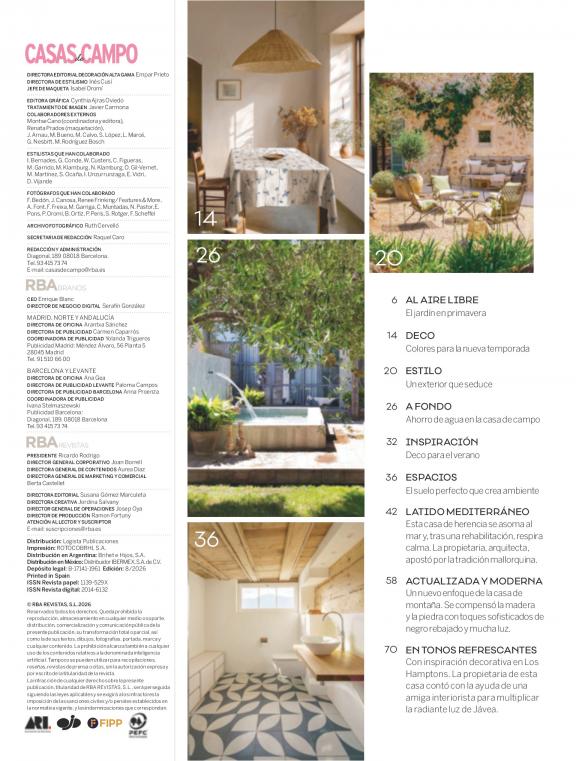 Especializada en la decoración y el estilo de vida campestres, despliega el encanto de las casas rústicas actualizadas. Y todos los elementos únicos de una casa de campo: porches tranquilos rodeados de flores, jardines pensados para disfrutar, salones con paredes de piedra vista, vigas de madera rehabilitadas o recicladas, chimeneas que aportan una extraordinaria calidez, piezas con sabor de antes, tejidos gustosos y nobles, trucos decorativos rustic chic... Y en muchos estilos diferentes para decorar una casa de ensueño: desde la elegancia del clásico al romántico provenzal o al luminoso mediterráneo.