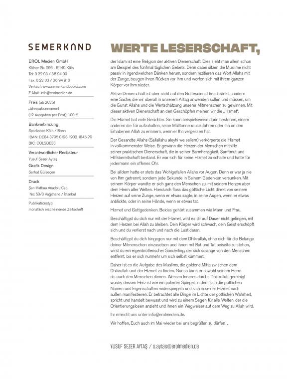 Semerkand – Die islamische Zeitschrift auf Deutsch Die Semerkand Zeitschrift ist eine monatlich erscheinende Publikation, die seit vielen Jahren eine Brücke zwischen klassischer islamischer Gelehrsamkeit und den Lebensrealitäten der heutigen Muslime in Europa schlägt. Sie behandelt Themen wie Glaubenslehre (Aqide), Gottesdienst (Ibade), Biografie (Sira) und Benehmen (Edeb) in einer klaren, tiefgründigen und zugleich verständlichen Sprache. Dabei stützt sie sich auf die Qur’an-Verse, die Sunna des Propheten (Sallallahu aleyhi we sellem) sowie auf die Weisheit der großen Gelehrten und Sufis vergangener Jahrhunderte. Die Zeitschrift legt besonderen Wert auf die Vermittlung von spiritueller Tiefe und praktischer Lebensführung: Sie erinnert an die Grundlagen des Glaubens und der Reinheit des Herzens. Sie stärkt das Bewusstsein für die Bedeutung von Moral, Familie und Gemeinschaft. Sie bietet Antworten auf die Fragen des modernen Alltags aus islamischer Sicht. Die deutsche Ausgabe eröffnet auch deutschsprachigen Muslimen – und jenen, die sich für den Islam interessieren – einen Zugang zu der reichen Tradition islamischer Weisheit. Mit ihrem literarisch-geistigen Stil ist die Semerkand Zeitschrift nicht nur eine Informationsquelle, sondern auch ein Wegweiser zur inneren Erneuerung und spirituellen Vertiefung.
