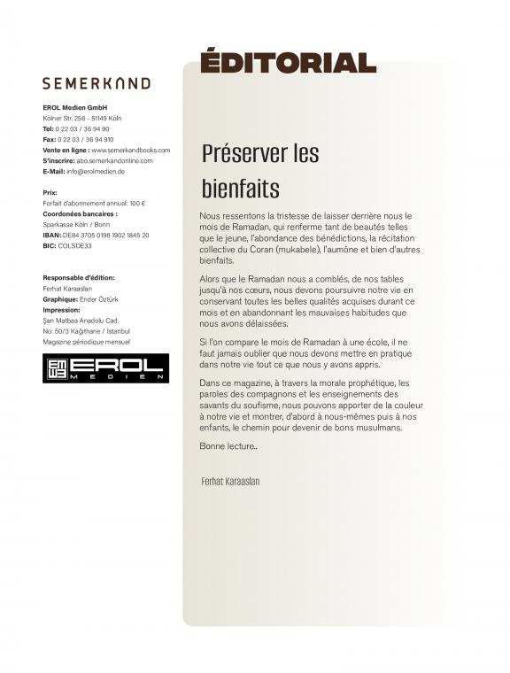 L’apparence intérieure À la lumière des versets et des hadiths, nous savons que le but principal est d’embellir nos coeurs. Nous observons que l’endroit où Allah le Très-Haut regarde est notre intérieur. Chaque action que nous accomplissons dans cette vie doit nous mener vers une belle moralité et embellir notre intérieur. À chaque instant, nous devons garder cette question à l’esprit et orienter nos efforts dans cette direction. Nous devons orienter notre boussole dans la bonne direction, et diriger notre vie au bon endroit, avec les bonnes personnes et les bonnes sources. Ce magazine que vous avez entre les mains est un remède qui nous mènera au but principal. En espérant qu’il soit bénéfique… Bonne lecture..