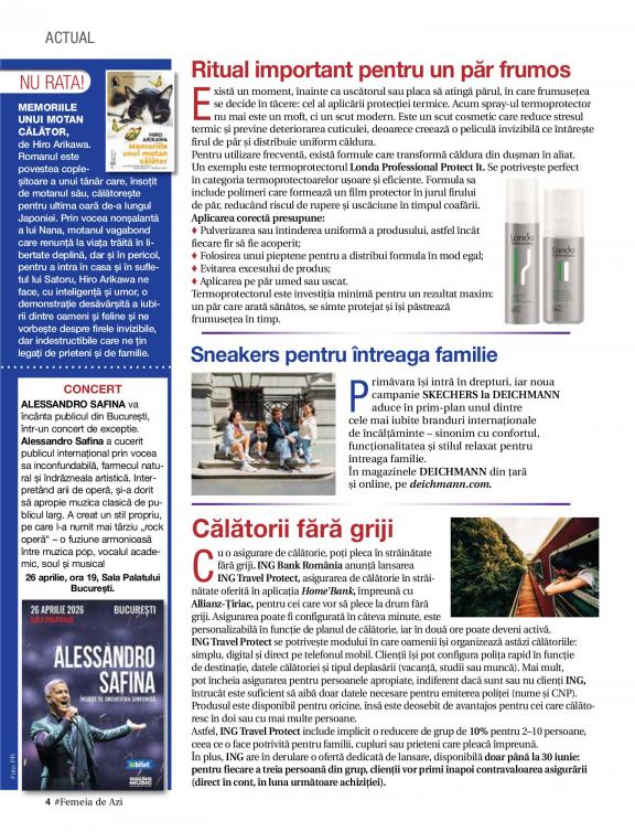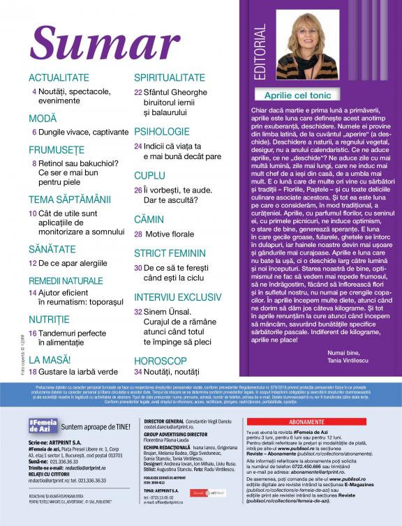 The information provided by Femeia de azi, is one of the present, a common everyday universe, close to the heart of women, debating topics of general interest, related to daily life. It addresses the woman concerned to learn more practical things, easy to reach, about health and lifestyle, eager to learn something new, to draw inspiration from fashion outfits from fashion markets.