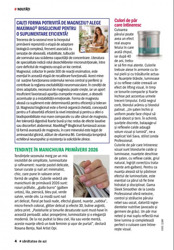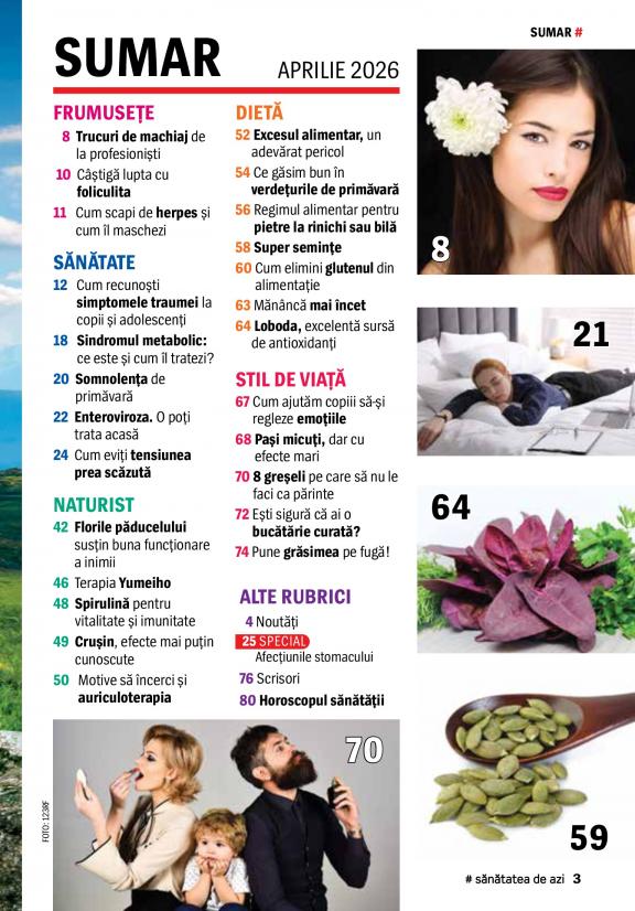 Sănătatea de azi is a magazine addressed to those interested in a healthy lifestyle, offering them helpful advice and effective tips concerning beauty, diet and frequent medical conditions. Inside the magazine you’ll find natural remedies and cures, alternative therapies, simple diets and easy recipies, so you can make little, but important changes in your life. At the same time, Sănătatea de azi keeps you up to date on medical research and offers you most accurate opinion from doctors.