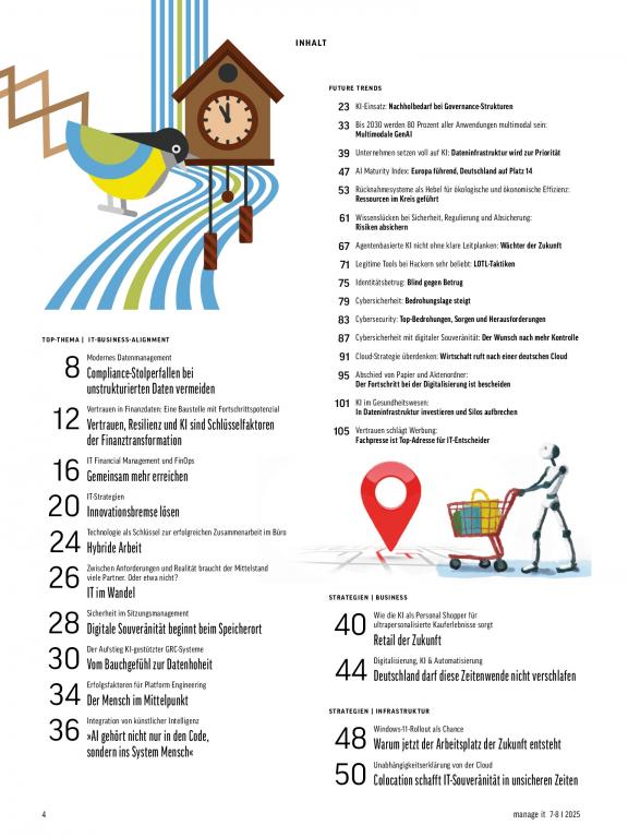 Lang- und mittelfristige Entscheidungen erfordern Informationen und Analysen, die sich nicht von kurzfristigen Trends beeinflussen lassen. »manage it« bietet den IT-Verantwortlichen und den Fachbereichen seit über 20 Jahren fundierte Beiträge, die sie bei der Suche nach der richtigen IT-Strategie im Unternehmen unterstützen. Kompetente Autoren aus Industrie, Hochschulen und Beratungsunternehmen schreiben Artikel mit Orientierung an der Praxis aber auch dem nötigen Weitblick.
