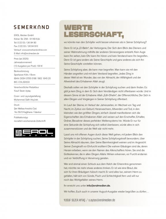Semerkand – Die islamische Zeitschrift auf Deutsch Die Semerkand Zeitschrift ist eine monatlich erscheinende Publikation, die seit vielen Jahren eine Brücke zwischen klassischer islamischer Gelehrsamkeit und den Lebensrealitäten der heutigen Muslime in Europa schlägt. Sie behandelt Themen wie Glaubenslehre (Aqide), Gottesdienst (Ibade), Biografie (Sira) und Benehmen (Edeb) in einer klaren, tiefgründigen und zugleich verständlichen Sprache. Dabei stützt sie sich auf die Qur’an-Verse, die Sunna des Propheten (Sallallahu aleyhi we sellem) sowie auf die Weisheit der großen Gelehrten und Sufis vergangener Jahrhunderte. Die Zeitschrift legt besonderen Wert auf die Vermittlung von spiritueller Tiefe und praktischer Lebensführung: Sie erinnert an die Grundlagen des Glaubens und der Reinheit des Herzens. Sie stärkt das Bewusstsein für die Bedeutung von Moral, Familie und Gemeinschaft. Sie bietet Antworten auf die Fragen des modernen Alltags aus islamischer Sicht. Die deutsche Ausgabe eröffnet auch deutschsprachigen Muslimen – und jenen, die sich für den Islam interessieren – einen Zugang zu der reichen Tradition islamischer Weisheit. Mit ihrem literarisch-geistigen Stil ist die Semerkand Zeitschrift nicht nur eine Informationsquelle, sondern auch ein Wegweiser zur inneren Erneuerung und spirituellen Vertiefung.