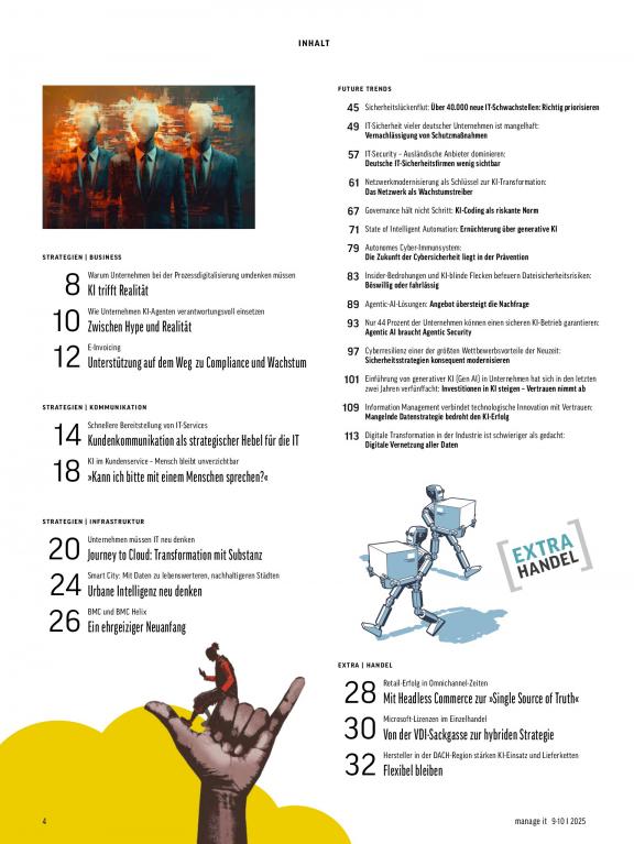 Lang- und mittelfristige Entscheidungen erfordern Informationen und Analysen, die sich nicht von kurzfristigen Trends beeinflussen lassen. »manage it« bietet den IT-Verantwortlichen und den Fachbereichen seit über 20 Jahren fundierte Beiträge, die sie bei der Suche nach der richtigen IT-Strategie im Unternehmen unterstützen. Kompetente Autoren aus Industrie, Hochschulen und Beratungsunternehmen schreiben Artikel mit Orientierung an der Praxis aber auch dem nötigen Weitblick.