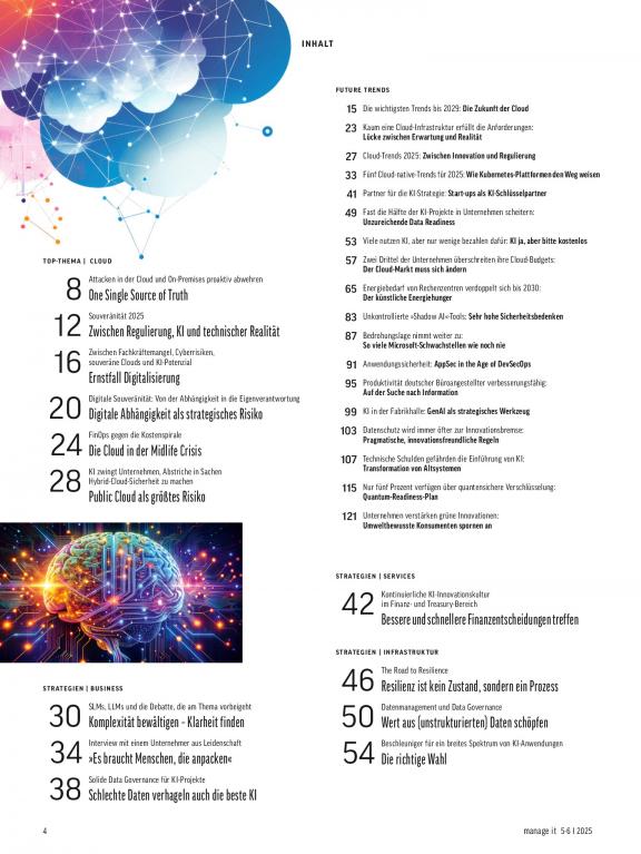 Lang- und mittelfristige Entscheidungen erfordern Informationen und Analysen, die sich nicht von kurzfristigen Trends beeinflussen lassen. »manage it« bietet den IT-Verantwortlichen und den Fachbereichen seit über 20 Jahren fundierte Beiträge, die sie bei der Suche nach der richtigen IT-Strategie im Unternehmen unterstützen. Kompetente Autoren aus Industrie, Hochschulen und Beratungsunternehmen schreiben Artikel mit Orientierung an der Praxis aber auch dem nötigen Weitblick.