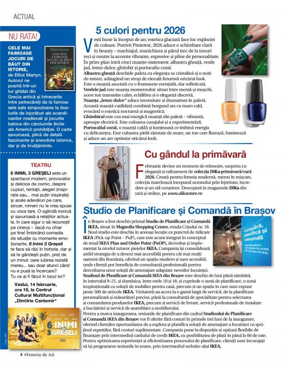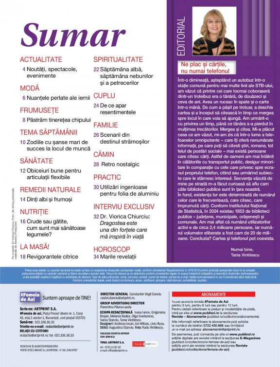 The information provided by Femeia de azi, is one of the present, a common everyday universe, close to the heart of women, debating topics of general interest, related to daily life. It addresses the woman concerned to learn more practical things, easy to reach, about health and lifestyle, eager to learn something new, to draw inspiration from fashion outfits from fashion markets.
