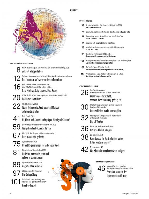 Lang- und mittelfristige Entscheidungen erfordern Informationen und Analysen, die sich nicht von kurzfristigen Trends beeinflussen lassen. »manage it« bietet den IT-Verantwortlichen und den Fachbereichen seit über 20 Jahren fundierte Beiträge, die sie bei der Suche nach der richtigen IT-Strategie im Unternehmen unterstützen. Kompetente Autoren aus Industrie, Hochschulen und Beratungsunternehmen schreiben Artikel mit Orientierung an der Praxis aber auch dem nötigen Weitblick.