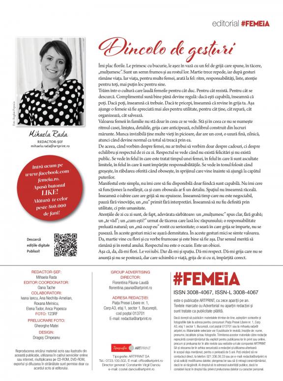 First issued in 1868, Femeia. is the first magazine for women in Romania. A powerful brand and a name that every woman knows, Femeia. is a social mark of femininity that constantly adapts to what being a modern woman means and an indispensable practical guide to living each day the best way possible. Encouraging active reading, involvement and communication, Femeia. serves as a strong voice that delivers simple, yet sound ideas about beauty, fashion, health, nutrition, family, culture and style.