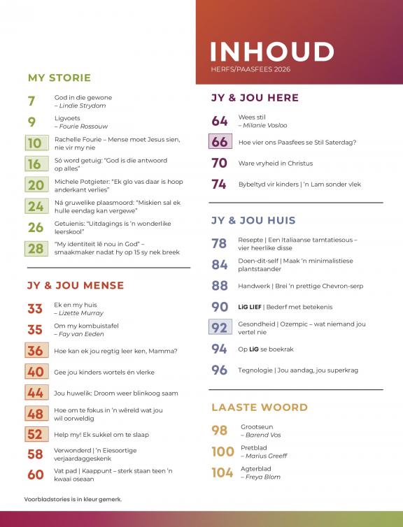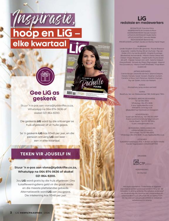 LiG is 'n praktiese gesins- en geloofsgids met Christelike inhoud wat verryk en inspireer. Dit is ’n asemskep-plek vir elke Christenouer. Deur mense se stories te vertel en praktiese raad te gee, inspireer, bemoedig en bring ons hoop. Ons stap saam op jou geloofsreis. Ons gee raad vir ouers, huwelike en almal wat in hulle geloof wil groei. LiG – vir jou en jou mense.