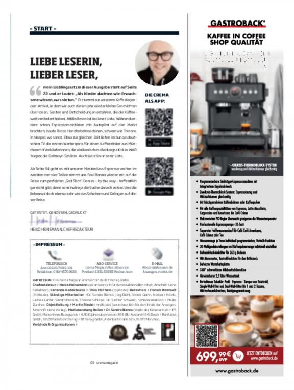 crema macht App-etit auf Kaffee! Lesen Sie Deutschlands meistgelesenes Magazin über Kaffee und Co. Tasten Sie über frisch gemahlene Bohnen und erfahren Sie den Genuss von Deutschlands beliebtestem Heißgetränk – auf Ihrem iPad. crema ist das Lifestyle-Magazin für alle Kaffee-Fans und ambitionierten Home-Barista. Das beliebte Hochglanz-Magazin ist nun endlich auch für das iPad erhältlich. In ausführlichen Reportagen im 3D-Look, Tests und Produktvorstellungen in höchster redaktioneller Qualität helfen den Lesern bei der Auswahl der passenden Espresso-/Kaffeemaschine, erklären welcher Kaffee schmeckt und wo man sie bekommen kann. Natürlich dürfen die schönsten und nützlichsten Accessoires dabei nicht fehlen. crema ist ein Magazin für alle, die rund um das Thema Kaffee eine Anschaffung planen oder einfach mehr über die braune Bohne wissen möchten. crema ist die App für Kaffeegenießer – in völlig neuem Look and Feel. Mit dieser App gibt es garantiert keinen bitteren Nachgeschmack. Schicken Sie uns Ihr Feedback an app@bt.de. Ihre crema-Redaktion