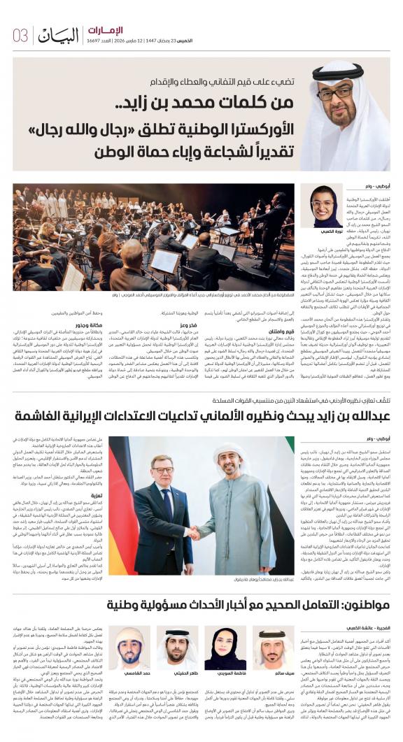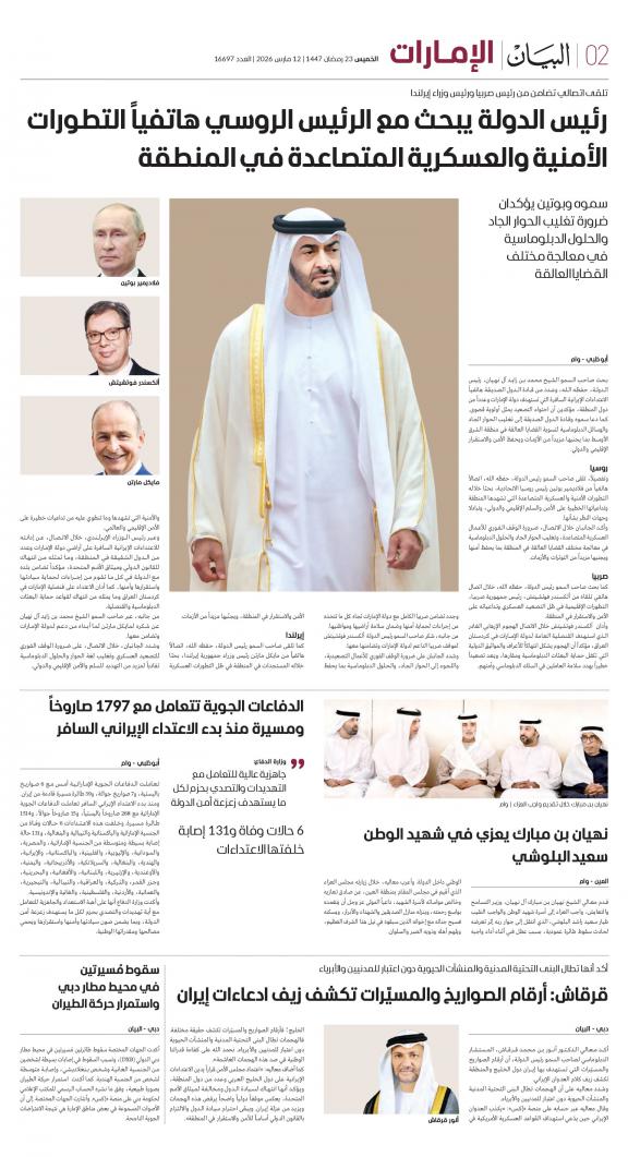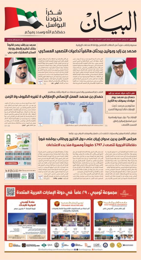يمكنك الآن الاستمتاع بتصفح النسخة الرقمية، والتي هي طبق الأصل عن النسخة الورقية لصحيفة البيان على هاتفكم الذكي أو الجهاز اللوحي أو على شاشة الحاسوب. النسخة الرقمية تتيح لكم تجربة متميزة للعدد اليومي بكل المقالات والأخبار والميزات وبطريقة سلسة حيث يمكنكم التمتع بقراءة صفحاتكم المفضلة مع إمكانية البحث ومشاركة الأخبار في أي وقت وأي مكان كمرادف عن النسخة الورقية. بالإضافة لميزة القراءة بدون إنترنت عند تحميل النسخة المطلوبة وميزات أخرى ستتعرفون عليها عند تحميل التطبيق. في العاشر من مايو سنة 1980 صدر العدد الأول من صحيفة "البيان" لكي تشكل خلال رحلة مستمرة خلال العقود الأربعة مدرسة صحافية خرجت أجيالا من الصحافيين على مستوى دولة الإمارات والعالم العربي. وتصدر الصحيفة، التي تتبع مؤسسة دبي للإعلام، يومياً في نسخ ورقية ورقمية، تصل الى جمهور عريض من المتابعين في دولة الإمارات وعلى امتداد العالم العربي والعالم.