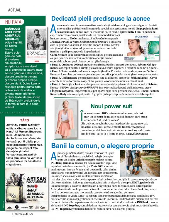 The information provided by Femeia de azi, is one of the present, a common everyday universe, close to the heart of women, debating topics of general interest, related to daily life. It addresses the woman concerned to learn more practical things, easy to reach, about health and lifestyle, eager to learn something new, to draw inspiration from fashion outfits from fashion markets.