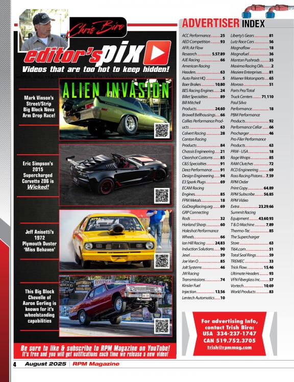 The focus of RPM is to bring a diverse mix of high performance street and race automobiles to life within its pages including: Race cars, musclecars, hot rods and street legal machines with an emphasis on the "Extreme" including Fast doorslammer and outlaw forms of Drag Racing. Not familiar with these types of cars? They are considered to be the top shelf of the industry and are on the edge with regards to design and power. Grab your copy today and check it out. We are sure you will want more!