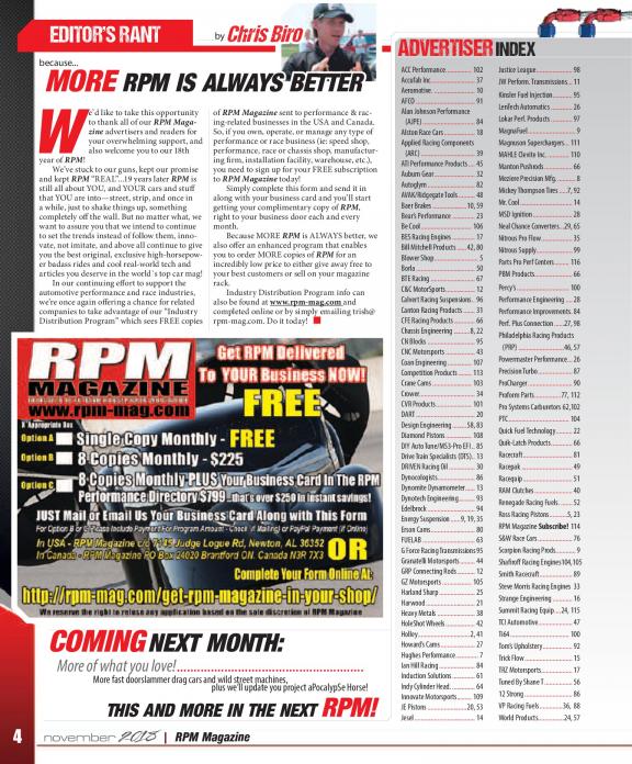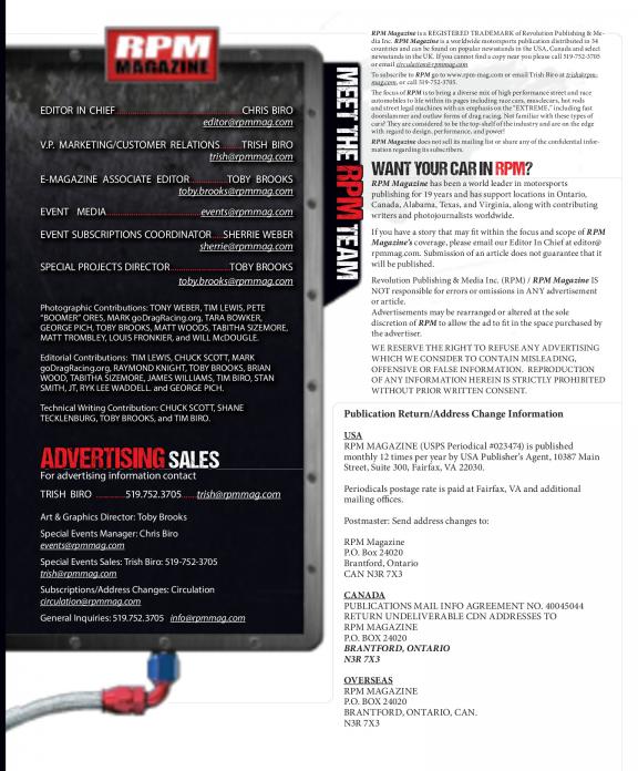 The focus of RPM is to bring a diverse mix of high performance street and race automobiles to life within its pages including: Race cars, musclecars, hot rods and street legal machines with an emphasis on the "Extreme" including Fast doorslammer and outlaw forms of Drag Racing. Not familiar with these types of cars? They are considered to be the top shelf of the industry and are on the edge with regards to design and power. Grab your copy today and check it out. We are sure you will want more!