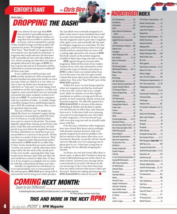 The focus of RPM is to bring a diverse mix of high performance street and race automobiles to life within its pages including: Race cars, musclecars, hot rods and street legal machines with an emphasis on the "Extreme" including Fast doorslammer and outlaw forms of Drag Racing. Not familiar with these types of cars? They are considered to be the top shelf of the industry and are on the edge with regards to design and power. Grab your copy today and check it out. We are sure you will want more!