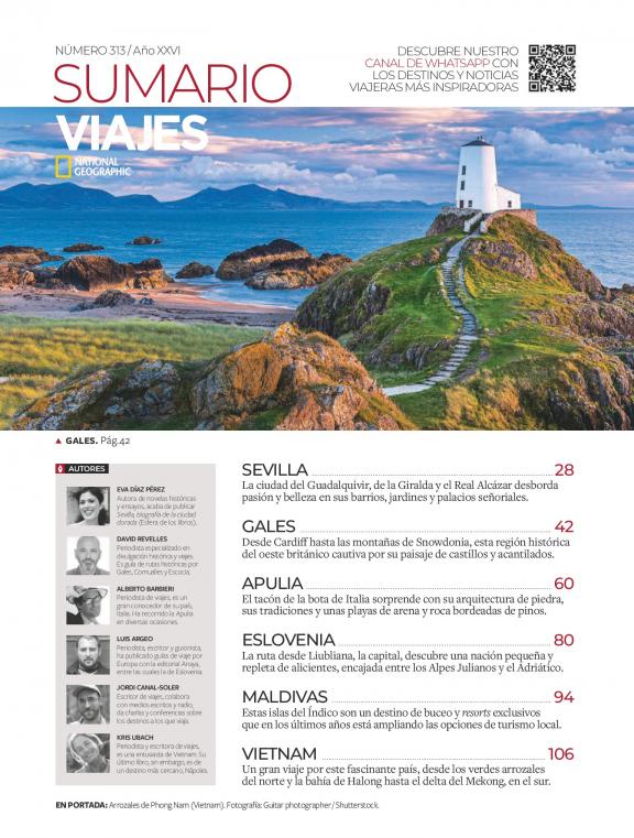 Los reportajes de la revista Viajes National Geographic son el medio idóneo para admirar la belleza del mundo, inspirarse o relajarse con ella, evocar antiguos viajes o plantearse otros nuevos. Con fotografías y textos de calidad excepcional, Viajes National Geographic presenta cada mes rutas por España, Europa y el resto del mundo, escapadas de fin de semana y paseos para conocer lo más atractivo de una ciudad, junto a experiencias en plena naturaleza o para disfrutar del patrimonio cultural.