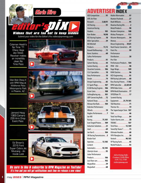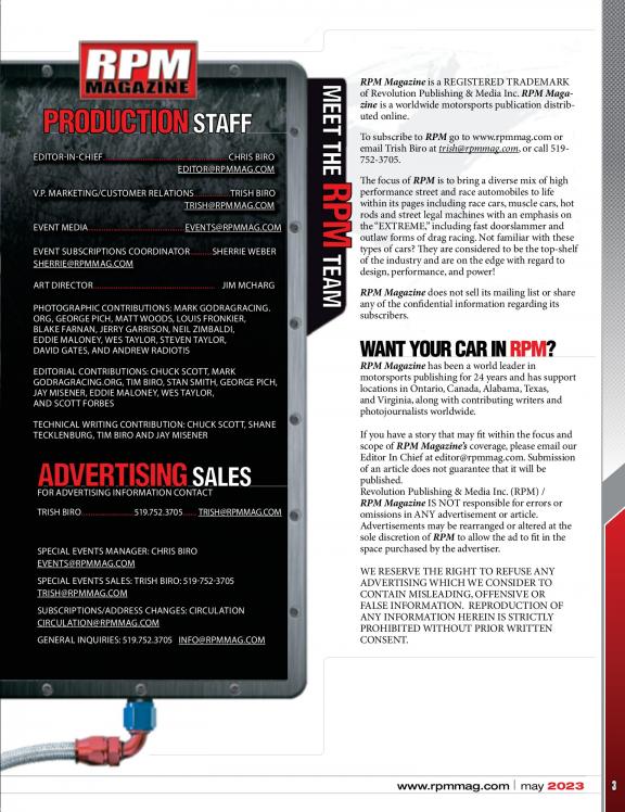 The focus of RPM is to bring a diverse mix of high performance street and race automobiles to life within its pages including: Race cars, musclecars, hot rods and street legal machines with an emphasis on the "Extreme" including Fast doorslammer and outlaw forms of Drag Racing. Not familiar with these types of cars? They are considered to be the top shelf of the industry and are on the edge with regards to design and power. Grab your copy today and check it out. We are sure you will want more!