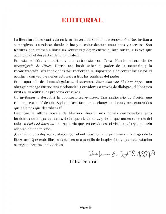 La Revista Digital Literaria El Gato Negro, es el resultado de un proyecto editorial y del anhelo de sus editores de dar difusión a la literatura y las artes. En nuestra revista encontrarás entrevistas a escritores, músicos, fotógrafos, dramaturgos, actores...reseñas de obras de teatro, libros, recomendaciones de libros, artículos sobre arte, pintura, películas... El Equipo de El Gato Negro os desea una feliz lectura