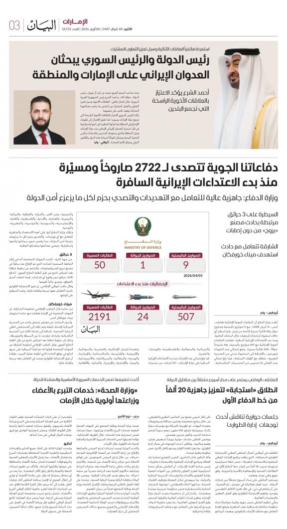 يمكنك الآن الاستمتاع بتصفح النسخة الرقمية، والتي هي طبق الأصل عن النسخة الورقية لصحيفة البيان على هاتفكم الذكي أو الجهاز اللوحي أو على شاشة الحاسوب. النسخة الرقمية تتيح لكم تجربة متميزة للعدد اليومي بكل المقالات والأخبار والميزات وبطريقة سلسة حيث يمكنكم التمتع بقراءة صفحاتكم المفضلة مع إمكانية البحث ومشاركة الأخبار في أي وقت وأي مكان كمرادف عن النسخة الورقية. بالإضافة لميزة القراءة بدون إنترنت عند تحميل النسخة المطلوبة وميزات أخرى ستتعرفون عليها عند تحميل التطبيق. في العاشر من مايو سنة 1980 صدر العدد الأول من صحيفة "البيان" لكي تشكل خلال رحلة مستمرة خلال العقود الأربعة مدرسة صحافية خرجت أجيالا من الصحافيين على مستوى دولة الإمارات والعالم العربي. وتصدر الصحيفة، التي تتبع مؤسسة دبي للإعلام، يومياً في نسخ ورقية ورقمية، تصل الى جمهور عريض من المتابعين في دولة الإمارات وعلى امتداد العالم العربي والعالم.